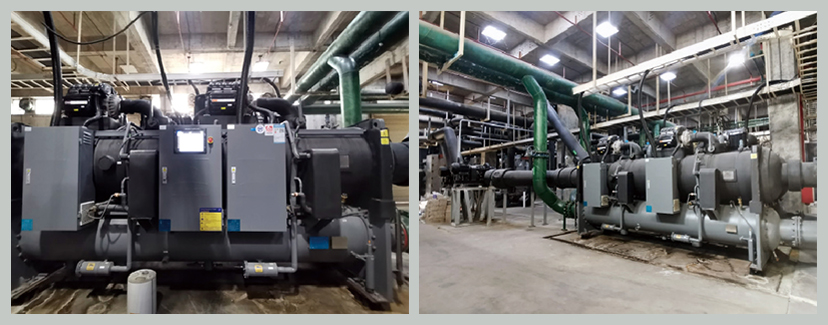 富士康觀瀾園區(qū)B25棟中央空調(diào)機(jī)房于2010年投用,位于二層能源中心,冷卻塔設(shè)于樓頂,為B10至B13棟廠房生產(chǎn)車間供冷。系統(tǒng)由4臺3867.6KW離心主機(jī)、1臺1933.8KW離心主機(jī)及1臺1760KW螺桿主機(jī)組成,全年不間斷運(yùn)行,能耗高、設(shè)備老化問題突出。