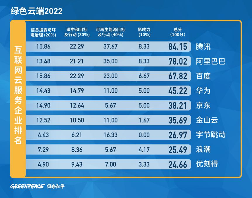 7月12日, 國際環(huán)保機(jī)構(gòu)綠色和平與中華環(huán)保聯(lián)合會(huì)共同發(fā)布《綠色云端2022》報(bào)告(以下簡稱“報(bào)告”),對(duì)國內(nèi)24家領(lǐng)先互聯(lián)網(wǎng)云服務(wù)與數(shù)據(jù)中心企業(yè)的碳中和表現(xiàn)進(jìn)行排名。