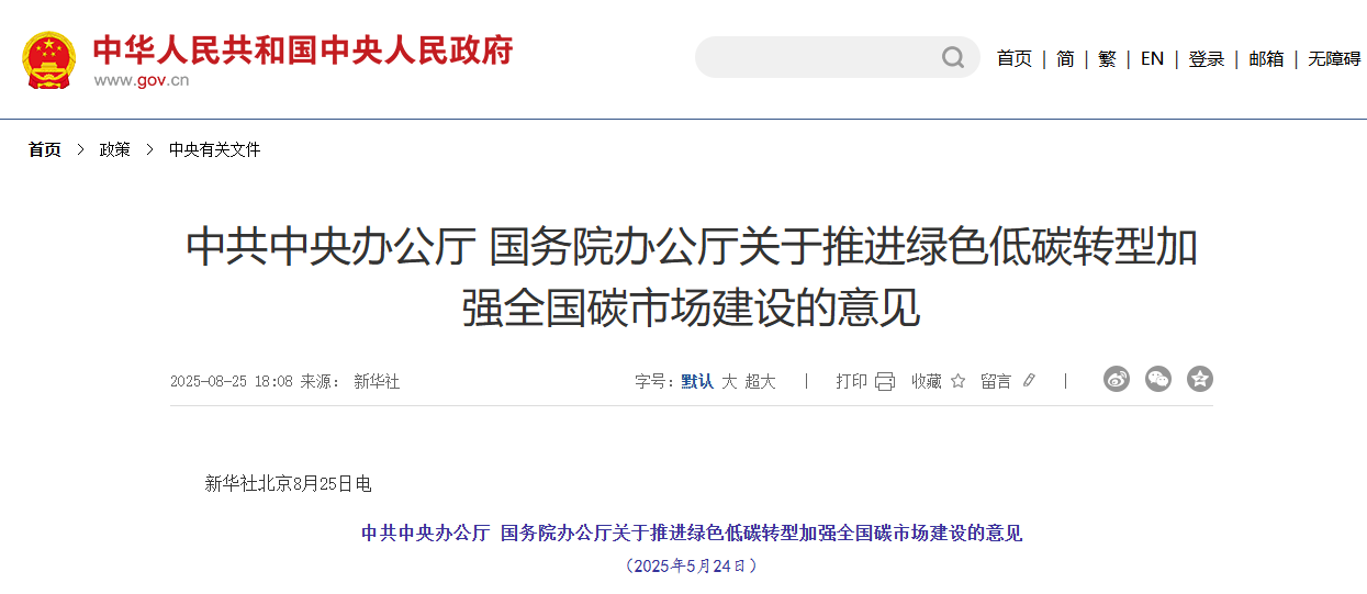 中共中央辦公廳、國(guó)務(wù)院辦公廳關(guān)于推進(jìn)綠色低碳轉(zhuǎn)型加強(qiáng)全國(guó)碳市場(chǎng)建設(shè)的意見